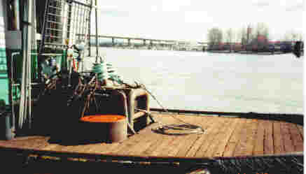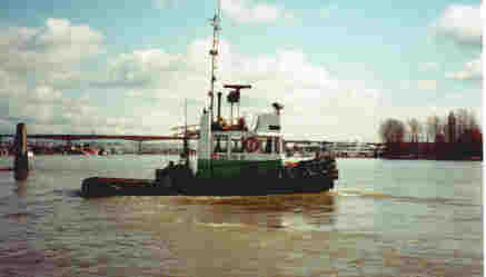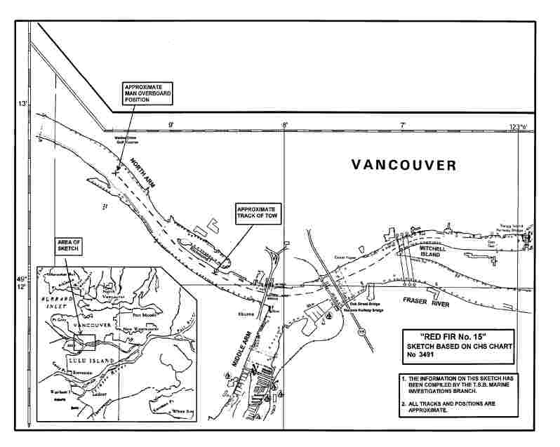 On 08 March 1994, the "RED FIR NO. 15" was moving the loaded chip barge "RT 1002" from the Crown Zellerbach Kent Street loading berth to the Point Grey tie-up in the North Arm of the Fraser River. Stemming the flood tide, the tow was making between three and four knots over the ground, with the operator steering. He was navigating by both visual means and by radar. The deck-hand was working on deck. The length of the tow-line to the barge was reportedly about 20 m.
