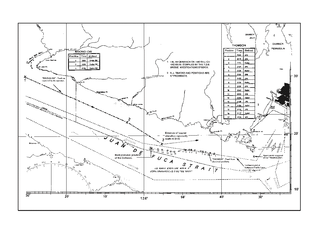 The Canadian tug "SEASPAN CAVALIER" responded to the "MAYDAY" message sent by the "MOONGLOW". The tug was towing two loaded lumber scows and, at 2120, was in approximate position 48°19.00′N, 123°49.3′W, some six miles ENE of the collision position. The tug was eastbound on a course of 103° (T) at a speed of 7.3 knots, and was keeping to the north of the traffic lane.