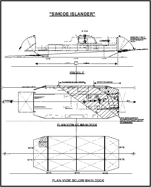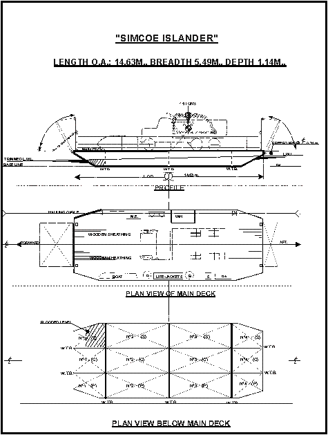 The "SIMCOE ISLANDER" is a self-propelled cable ferry of all-welded steel construction. She was fitted with diesel-engine-driven hydraulically powered propulsion gear, friction-drive wheels, fairleads, and 19 mm-diameter wire cable, which, together with the enclosed control shelter for the operator, are located on the starboard side of the main deck. The hull is of simple barge form with symmetrical raked ends, and is sub-divided into 12 watertight compartments by two longitudinal and three transverse bulkheads.