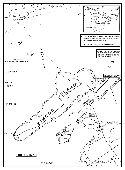At about 1035Footnote 3, 12 September 1995, the cable ferry "SIMCOE ISLANDER", after loading a large truck carrying some eight long tons (hereinafter referred to as tons) of limestone boulders, began crossing from Wolfe Island to Simcoe Island. The weather conditions were relatively light, with a 15 kph south-westerly wind, slight swell, and a 30 cm chop acting on her port side.