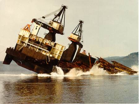 Dumping is a quick method of unloading a deck cargo of logs, but it is not a procedure that has been perfected to the point where it is a fully controlled and predictable exercise. Simply, dumping is effected by heeling the barge by filling its integral tipping tanks and allowing the deck cargo of logs to slide off under their own weight. During this process, the forces involved result in a reaction which causes the barge to move away from the dumping logs. "As the tipping tanks fill with water ... the barge begins to assume an ever-increasing angle of heel, and ... there comes a point where the buoyancy of the barge overcomes the friction of the logs on the deck and the barge moves sideways out from under the load."Footnote 4