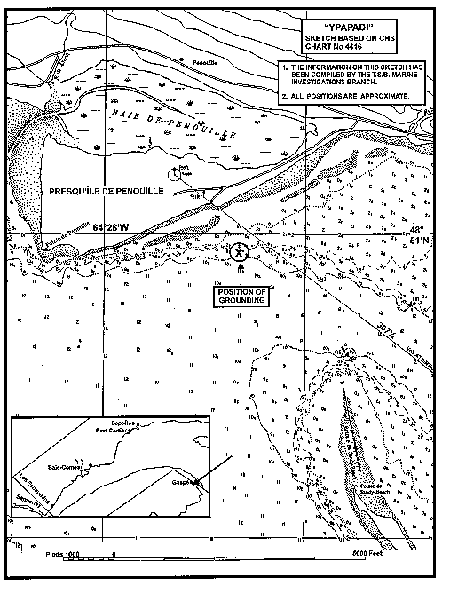On 17 November 1996, the "YPAPADI" departed Caleta Caluso, Chile, with a cargo of copper phosphate, bound for Gaspé. Although Gaspé is a non-compulsory pilotage port, the vessel owners requested the agents in Montreal to arrange for a pilot to meet the vessel and conduct her to the berth. One week before the arrival of the vessel, the master was advised by the vessel agency in Montreal that a pilot would board at the entrance to Gaspé harbour. The master was also provided with the latitude and longitude where he should rendezvous with the pilot boat.