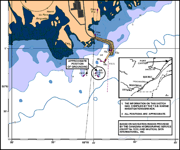 On 14 December 1996, the "FEDERAL CALUMET" was shifting from the Uniforêt Dock to an anchorage to await better weather conditions before completing loading. With a pilot on board and two tugs assisting, the ship departed at about 1225. The tugs were to turn the vessel quickly onto an appropriate easterly heading, giving her a clear run into the prevailing sea and swell. High and confused seas, and a northeast gale, prevented the aft tug from performing the manoeuvre as planned, and the ship drifted to the south. At about 1231, it was noticed that the ship did not appear to be moving or responding to engine or tug movements. The ship was found to have grounded in way of the No. 3 starboard double-bottom tank. The tugs held her in this position until the rising tide refloated her at about 1400. The vessel then proceeded, unassisted, to Sept-Îles, Quebec, for damage assessment and repairs.