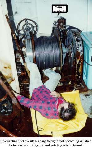 25-fathom warning mark on it. At that point, he decided to climb over the after end of the winch to handle the controls; he neither went around the winch to gain access to the controls nor did he call out to deck-hand No. 2 to return to the controls. He put his left foot on the after barrel shaft bearing housing in the vicinity of the grease nipple and when his weight came on the housing, his left foot slipped and he fell to the deck. His right foot was drawn into the winch and caught between the incoming wire and the turns already on the winch barrel. As his foot was being dragged on to the winch barrel, he called out to the deck-hand No. 2 who immediately returned to the controls and stopped the winch.