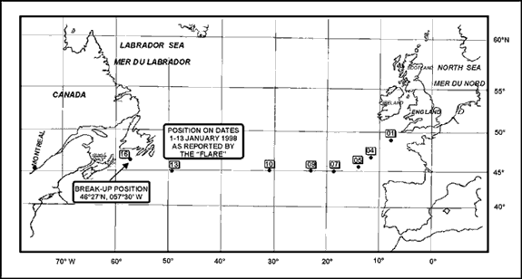 After the "FLARE" cleared the English Channel, the weather deteriorated and, on 01 January 1998, gale force westerlies with heavy seas were experienced. In an endeavour to find better weather, the master decided to proceed as far south as 45 north latitude (N) and to follow that parallel in a westerly direction (see Chart 1, Atlantic Crossing).