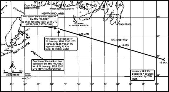 On 16 January 1998, en route from Rotterdam, Netherlands, to Montreal, Quebec, in severe weather conditions, the "FLARE" was approximately 45 miles southwest of the islands of Saint-Pierre-et-Miquelon. The vessel broke in two and the stern section sank within 30 minutes. Thebow section sank four days later off Nova Scotia, on the western side of Banquereau Bank. Twenty-one of the crew perished and four survived. There was widespread, non-recoverable, fuel oil pollution from the sunken stern section.