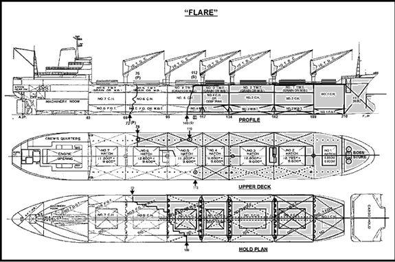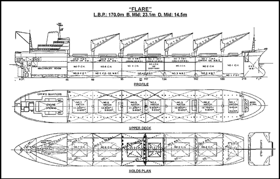 The "FLARE" was built in Japan in 1972, as a single-deck, dry bulk cargo vessel of all-welded steel construction. The vessel was propelled by a marine diesel engine driving a single, fixed-pitch propeller. The propelling machinery, steering gear, wheel-house, life-saving equipment and all crew accommodation were arranged at the after end of the vessel. The locations of the seven dry cargo holds and all water ballast tanks and oil fuel tanks were as shown in Figure 1, Outline General Arrangement. The hull was strengthened for the carriage of ore cargoes, such that holds Nos. 1, 4 and 6 could remain empty, and hold No. 4 could be used as a water ballast tank. The hull was subdivided by nine transverse, watertight bulkheads, together with an inner bottom tank top, which extended fore and aft in way of all of the cargo holds and the engine-room. The main deck, upper wing tanks, inner bottom and bottom shell plating throughout the length of the cargo holds were framed