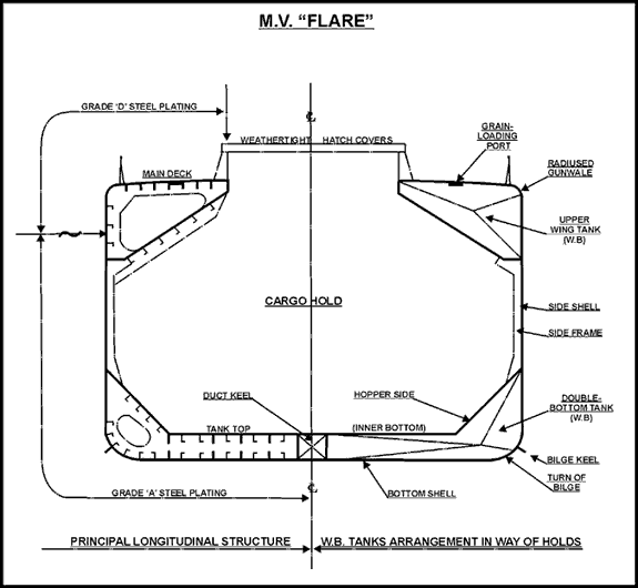 The principal construction and general layout of the cargo hatchways, holds, upper wing water ballast tanks, double-bottom tanks, and duct keel were as shown in Figure 2, Typical Cross Section.