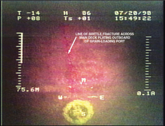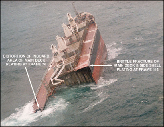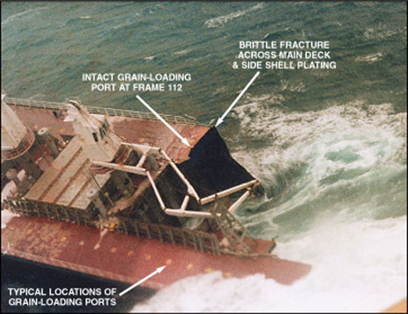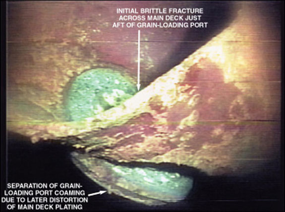 The hull was generally constructed with Lloyd's Grade A steel, and the main deck plating outboard of the cargo hatchways, radiused gunwale and sheer strake, were of more notch- (fracture-)resistant Lloyd's Grade D steel.