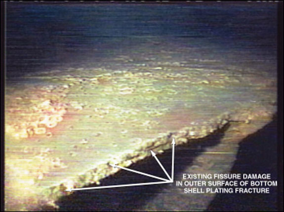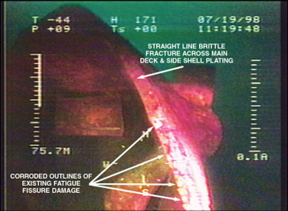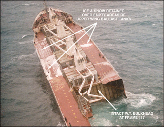 The survivors reported that some of the crew members were startled by the severity of the latter vibrations, which were followed by the sound of the general alarm ringing. Shortly thereafter, upon their arrival on deck, they saw that the vessel had broken in two. The whole crew was on the after part of the vessel.