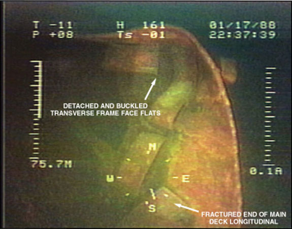 At about 0000 ship's time (0400 coordinated universal time [UTC]Footnote 3) on January 16, a very loud bang was heard (due to the slamming of the forefoot), which was followed by severe whipping and longitudinal flexing of the hull. Approximately four and a half hours later, another particularly loud bang was heard, which also was followed by severe hull whipping and vibration.