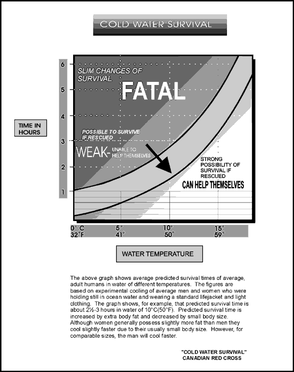 The survivors indicated that they were in the nine-degree Celsius (°C) water for approximately 20 to 25 minutes. They were not suffering from hypothermia and did not require medical treatment when rescued. According to the Canadian Red Cross Cold Water Survival Chart (Appendix B), a person wearing a standard lifejacket and light clothing in water of 8 to 10°C could expect to survive for two to three hours before succumbing to hypothermia.