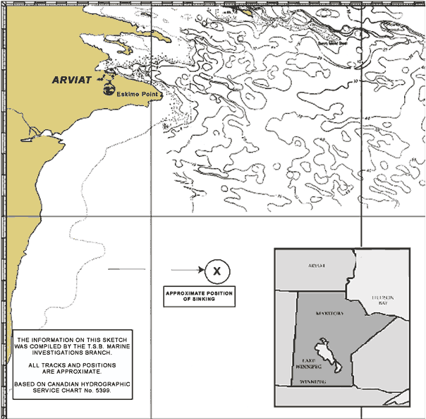 On 21 August 2000, the Avataq arrived in the Port of Churchill, Manitoba, to discharge a small amount of cargo and to load for a return voyage to Arviat and Rankin Inlet, Nunavut. The vessel departed Churchill at 0500 central daylight timeFootnote 2 on August 24 and proceeded on a course northwards following the 94th meridian. At approximately 2330, as the vessel came into radio range of Arviat, the captain initiated a series of radio calls, on CB radio Channel 14, advising a relative that the crew were on deck re-securing cargo that had come loose and that they expected to arrive in Arviat at 0200 the next morning. Another radio call at 0030 indicated that the vessel was in a position 10 nautical miles south of Arviat, that the bilge pumps were not working properly, and that the vessel was taking on water. A final radio transmission was heard from the vessel at 0130 advising that the Avataq was taking water over the bow and stern and was sinking. Despite attempts by the shore station to contact the vessel, no further transmissions were heard.