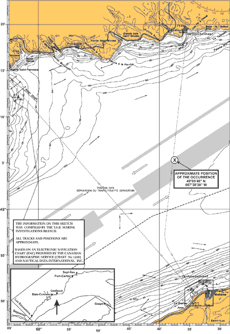 Before the watch changed, around 1200,Note de bas de page 2 off Pointe-des-Monts, the master reported to Marine Communications and Traffic Services (MCTS) in Les Escoumins that the vessel had passed calling-in point 2A. Meanwhile, the third engineer joined the fourth engineer in the engine room.