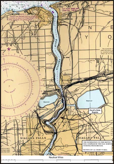At approximately 1730 eastern daylight timeFootnote 1 on 02 September 2001, the Saute Moutons 14 set out from Niagara-on-the-Lake with 43 passengers. The trip was uneventful until 1814, when the final trip from the Niagara Gorge Whirlpool near Devil's Hole began. Just prior to entering the Devil's Hole rapids, the passengers were asked if they wished to proceed 'sideways' into the rapids. Reportedly, the majority of passengers agreed (see Appendix A - Area of Occurrence).