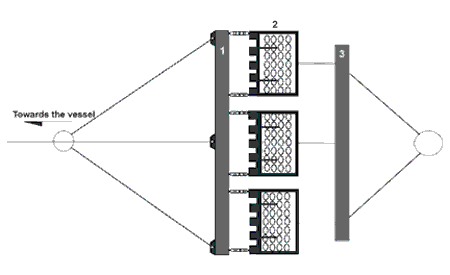 The scallop drag used by the Alex B. 1 is made up of three steel scallop rakes (see Figure 2). The three rakes (2) are rigged side-by-side and fastened to a steel beam (1), which is in turn fastened to a bridle and drag line. A wooden beam is fastened aft of the three rakes (3) to stabilize the drag on the seabed.
