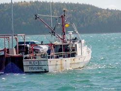Two portable pumps were used to pump out the compartments. The keel touched bottom at low tide, and the vessel listed, revealing a hole in the port side planking. The water ingress was stopped temporarily, and on 26 October 2001, after being towed to Sept-Îles, Quebec, the Alex B. 1 was hauled up on the shore for a detailed inspection of the hull.