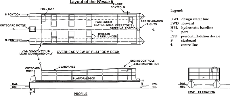 The Wasca II, a "Starlighter" catamaran-type small passenger vessel, consists of two cylindrical aluminum pontoons 450 mm in diameter, 8.8 m long, spanned by a wooden deck over welded frames and cross beams. Aluminum railings surround the perimeter of the passenger deck. Three rows of twin plastic seats, attached to aluminum footings on either side of the centre line, provide seating for 12 passengers. The steering position and the control console are located at the port side forward, and the outboard motor is mounted at the stern.