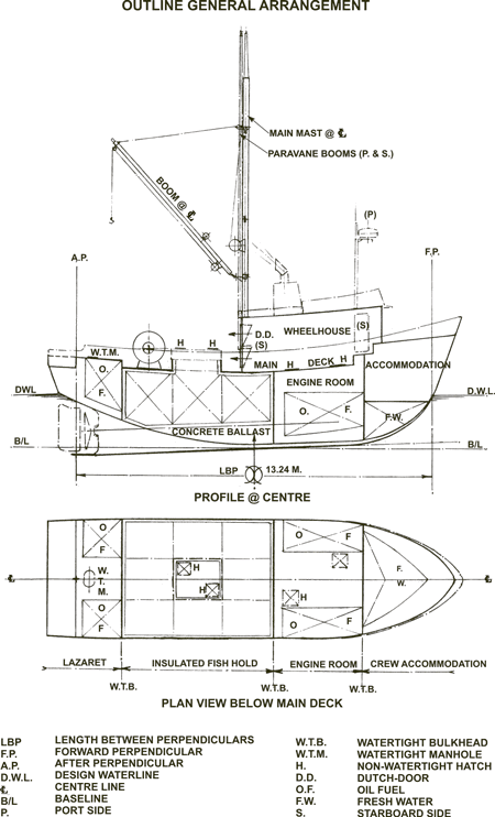 Below the main deck the hull was sub-divided by three transverse watertight bulkheads into the following compartments: forward crew accommodation space; engine-room; fish hold, and lazarette space (see Appendix A).