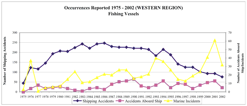 Most recent data on 86 accidents investigated since 1990 show that no LFV and fewer UFV [uninspected fishing vessels] accidents were investigated after 1994 within the scope of this research. This could be because the number of vessels in this segment of the fleet had diminished significantly or simply because of the unavailability of key occurrence data in variables extracted.