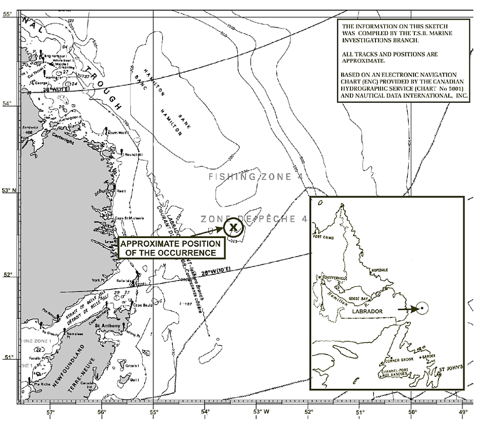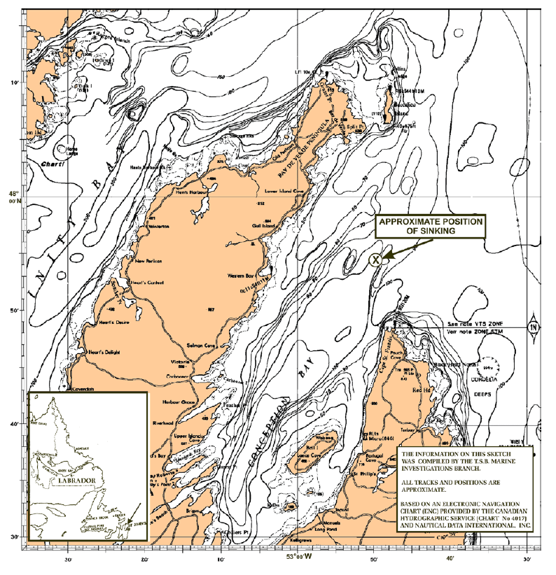 On the afternoon of 17 March 2002, while stopped in ice and waiting for a change in the weather, a fire broke out in the bow of the large fishing vessel Katsheshuk. After an unsuccessful attempt at fighting the fire, the decision was made to abandon the vessel. Several days later, the tug Atlantic Maple took the vessel into tow and steamed towards St. John's, Newfoundland and Labrador. The tug and tow encountered adverse weather and were forced to seek refuge in Trinity Bay, Newfoundland and Labrador. When the weather finally moderated, the tow resumed. On the morning of 30 March 2002, while approximately six nautical miles north-west of Cape St. Francis, Newfoundland and Labrador, the Katsheshuk listed and sank.