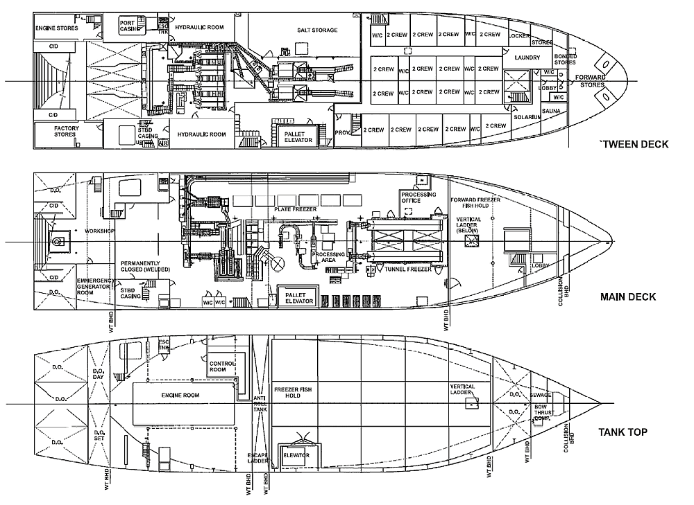 The vessel was built in Norway in 1987 as a single-screw stern trawler of all-welded steel construction, equipped for on board scallop processing and freezer storage. The navigating bridge and crew accommodation were located forward, the factory was located at midships and the engine room was located aft. In 1988, it was imported to, and registered in, Canada. In 1991, the vessel was converted to a shrimp trawler and was engaged in the shrimp fishery on the East coast of Canada. In 2001, the ship was purchased by the current owner. The hull was subdivided by seven transverse watertight bulkheads, five of which extended from the keel up to the main deck level, while the sixth extended up to the shelter deck as a collision bulkhead. A seventh watertight bulkhead extended from the main deck up to the ‘tween deck and was used to divide the forward freezer hold from the lower processing area. A watertight inner bottom, enclosing double-bottom tanks extended for the length of the fish hold, while the hull in way of the main engine room was of part double-bottom construction (see Figure 1a).