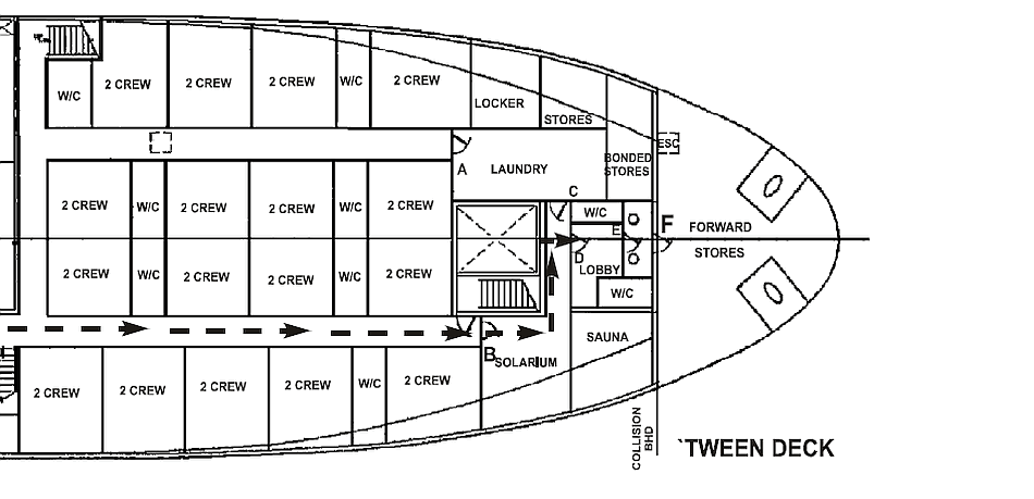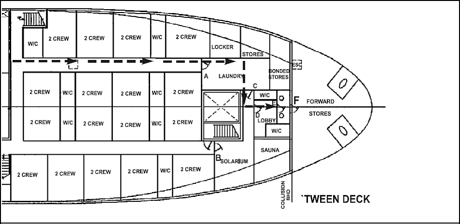 The first fire party lead opened door D and entered a small foyer where he was met by a wall of smoke. Upon opening either door E or F, he was met with heat and flame. The second fire party lead made it to door D and when he opened it, he was met by a white flame which shot out over his head and hit the deckhead. Door D provided access to the compartment which housed the spurling pipes and door F provided access to the forward stores. This would suggest that the fire originated either in the compartment housing the spurling pipes or in the forward stores.