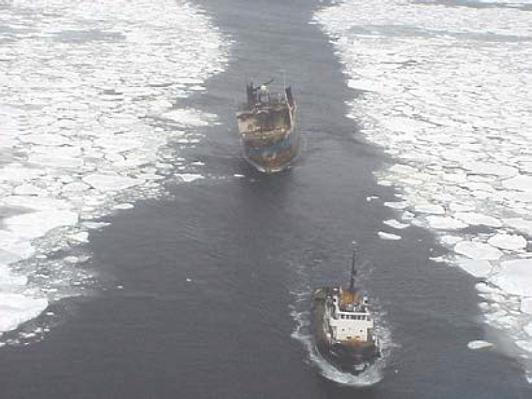 The owners of the Katsheshuk hired the tug Atlantic Maple to tow the vessel to port. By the time the tug arrived on the scene, the now derelict vessel had drifted approximately 168 nautical miles to the south. On the morning of 26 March 2002 (see Photo 4), the Atlantic Maple escorted by the CCGS Henry Larsen took the Katsheshuk under tow. The original plan was to tow the vessel directly to St. John's Newfoundland and Labrador, but due to high winds, the tug and tow were forced to seek shelter in Trinity Bay and later Conception Bay.,