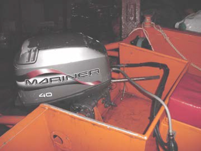 The Katsheshuk had a 5.4 m rescue boat equipped with a 40 HP outboard motor which formed part of the vessel's safety equipmentFootnote 11. The remote steering control on the rescue boat was reported to have been unserviceable since mid-January 2002. To allow for steerage, an improvised tiller arm (see Photo 5) had been jury-rigged to the outboard motor. This ad-hoc arrangement required the rescue boat to have two operating personnel, one to steer the vessel and a second to operate the throttle.
