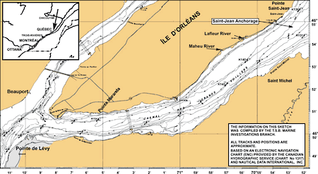 The "Saint-Jean anchorage" is not included in the Sailing Directions. It is found southeast of Pointe Saint-Jean, le d'Orléans, where it provides a mud-bottom anchorage 10 to 24 m deep. Located at the upstream intersection of the Chenal du Sud and the Traverse du Nord, it is marked on the north by buoy K135 and on the south by buoy K131. Its western edge approximates the eastern end of the port of Québec. To the northeast is the south cardinal buoy DAME, which shows the start of the le Madame Reef. The northwest edge of the anchorage is in proximity to the Saint-Michel range, which runs 033°- 213° (see Figure 2).