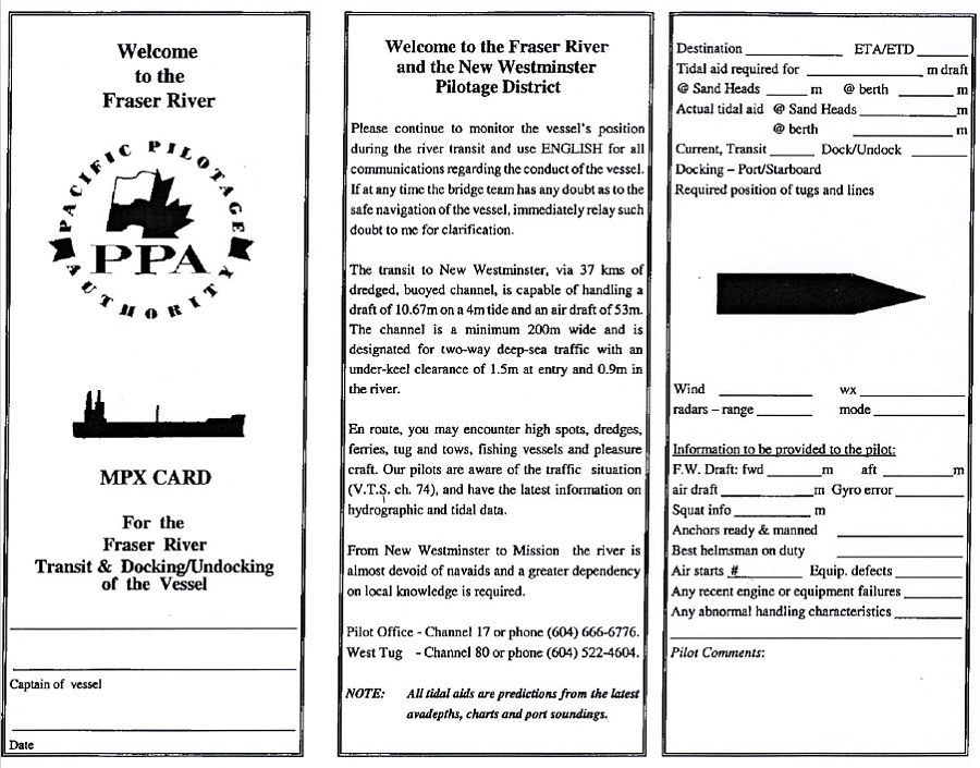 It is customary for the river pilot to present the master with a copy of the Master Pilot Exchange Card, which outlines basic information on the channel width, tidal/current information for the passage, and tug fastening positions. See Appendix A for an example of the card. The master of the Cielo del Canada was not presented with the card; however, it was reported that the river pilot discussed some of the contents of the card with the master.