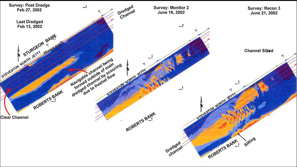 Surveys are conducted by Public Works and Government Services Canada, and the Fraser River Port Authority maintains the dredged channel. The frequency of these surveys is dependant on the rate/stage of the river flow, and this is assessed by the discharge rate at Hope. Field Charts for the use of the river pilots are usually produced and dispatched to them within 36 hours of the surveys.