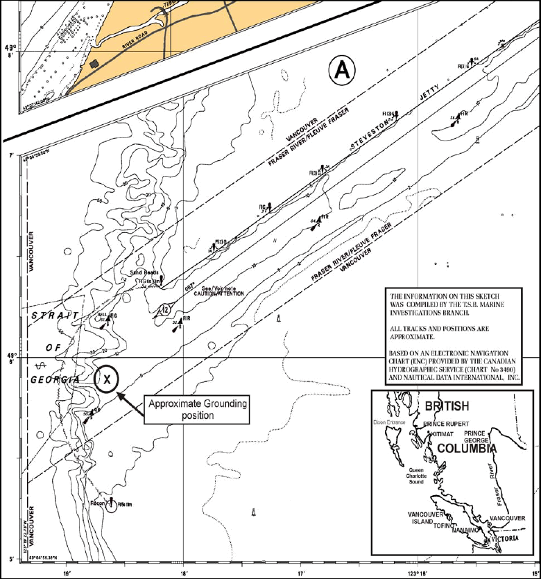 - While the master and officer of the watch were so engaged, and while proceeding at a reduced speed, the vessel began sheering to port. The pilot requested starboard helm and slow ahead on the engines to counteract the swing. However, at 0828 the vessel ran aground on a soft ledge while still within the buoyed channel, between buoys S2 and S0, in position 49°05′55″ north, 123°18′39″ west. At the request of the coast pilot, the river pilot returned to the vessel and assisted with the refloating.