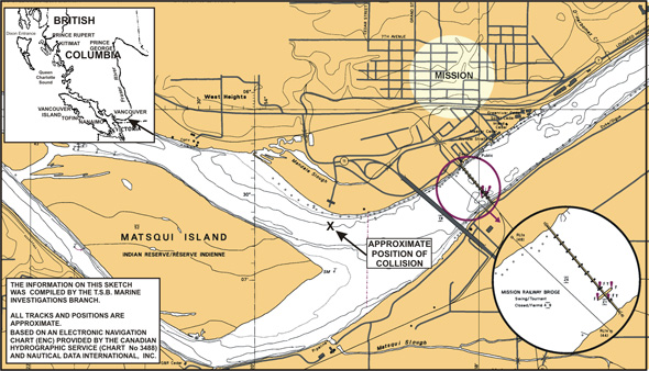 The collision occurred around 2300, 20 December 2003, in a position approximately 1200 m west of the Highway bridge at Mission, B.C. The starboard side of the pleasure craft Mistral came in contact with the starboard bow of the deck barge Packmore 4000 under tow by the tug Tiger Shaman. The Mistral's occupants were thrown into the water as the pleasure craft broke into pieces and was overrun by the Packmore 4000.