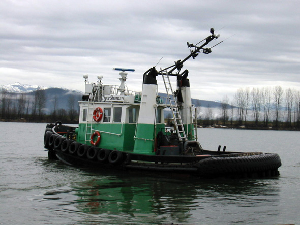 The Tiger Shaman is steel-built tug based at Mission, B.C. It does not have berthed accommodation and is used as a shift vessel, under the conduct of a certificated master with the assistance of a deckhand during towing operations on the Fraser River. The wheelhouse is fitted with windows on all four sides, and the main control consol is centred at the forward windows. Navigation instruments include a magnetic compass, echo sounder, two VHF radios, and radar. A secondary control station is located on the wheelhouse top. The towing winch is situated on the main deck aft of the wheelhouse between two vertical, engine-exhaust trunks (see Photo 2).