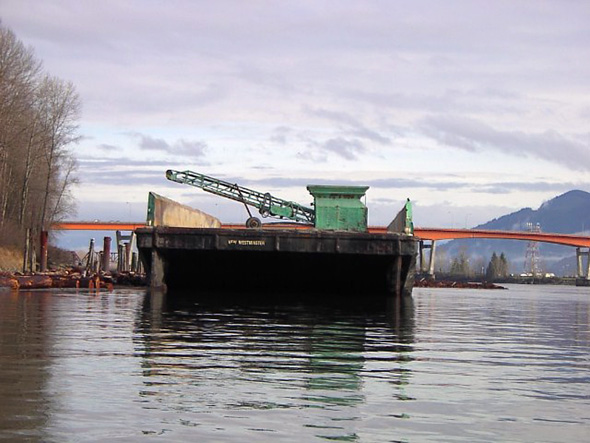 Spanning the Fraser River at Mission are two bridges: a CPR railway bridge and, 500 m to the west, the Highway No. 11 road bridge. The highway bridge is a fixed span with a stipulated clearance of 19 m. The railway bridge has a lower profile and is supported by 13 concrete piers with a swing span situated near the south shore to allow passage of high air draft vessels. Marine traffic with low air draft, such as the Tiger Shaman and Packmore 4000, transit through the channel beneath the fixed span of the rail bridge between support piers 5 and 6 from the north bank.
