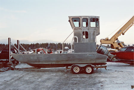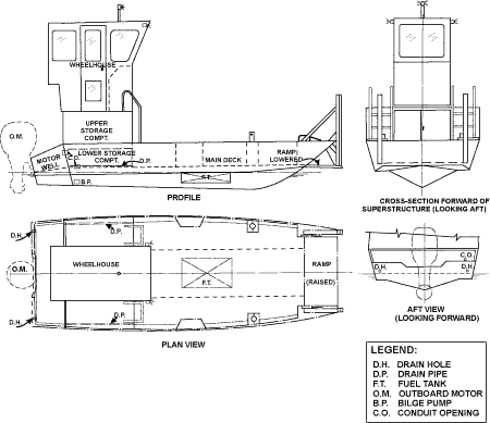 The workboat was constructed of aluminum and originally had a partially enclosed steering station located aft. A hinged ramp was fitted at the bow, which also incorporated two vertical push knees (or fenders), one on each side, for pushing barges. The below-deck side compartments were filled with closed cell foam to provide non-permeable inherent buoyancy, while the centre compartments formed void spaces.