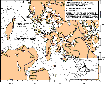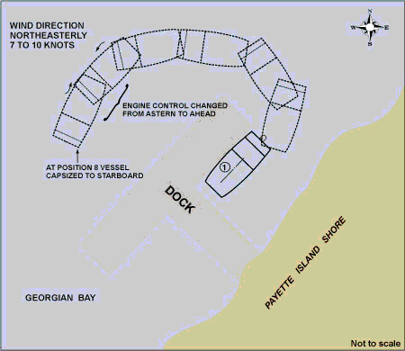 The vessel capsized in position 44°53.5′ N and 079°53.12′ W in 5.5 m of water. Nobody was wearing a lifejacket. The cramped space within the wheelhouse made it difficult for persons to escape through either the starboard or port wheelhouse doors. Upon exiting the wheelhouse, some persons managed to shed their work boots and two persons swam to the dock. One person climbed onto the overturned hull and remained there until the vessel drifted closer to shore. He was then helped to shore. The crew member struggled briefly, but then slipped beneath the surface of the water within 1.5 m of the dock. It took approximately three minutes from the time of the capsizing for the three survivors to arrive ashore. They entered a nearby cottage and used a telephone to call 911.