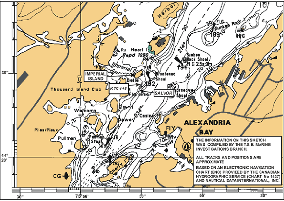 On 27 July 2004, at 0445 eastern daylight time, the Canadian tug Salvor, pushing the single-hull tank barge KTC 115, loaded with approximately 9117 metric tons of liquefied calcium chloride was exiting American Narrows at Alexandria Bay, New York, United States, when it experienced a steering failure that shifted the rudder hard to starboard. A chain securing the starboard face wire failed, causing the tug to break free from the barge. The barge continued downstream and grounded on the north side of the channel, spilling approximately 60 tonnes of calcium chloride.