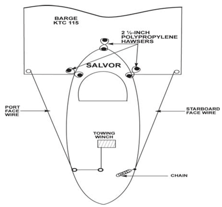 The Salvor, as is common with tugs operating in towing mode, was equipped with an emergency disconnect system for rapidly releasing the barge. However, the connection between the Salvor and the KTC 115 was such that, although the port face wire was connected to the towing winch (and hence to the emergency disconnect), the starboard face wire had no emergency disconnect. Therefore, the vessel could not be rapidly released from its barge if the port wire failed or another emergency occurred, placing the vessel and crew at increased risk.