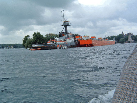 Arriving on the bridge, the master called the approaching tanker Thalassa Desgagnes (laden with heavy fuel oil), informing them that the tug had separated from the barge and that he did not have control of the barge. The master then placed a radio call to Seaway Clayton apprising them of the situation. Seaway Clayton then contacted the Salvor requesting clarification. Free of the tug, the barge continued downstream and grounded on the north side of the channel adjacent to Imperial Island in position 44°20′25″ N, 075°55′30″ W. During this time, the crew of the Salvor was unaware of the position of the barge until it was located by the passing Thalassa Desgagnes.