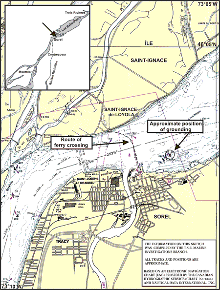 In the early morning of 27 April 2004, the ferry Catherine-Legardeur left Sorel, Quebec, with 15 passengers and 12 vehicles bound for Saint-Ignace-de-Loyola, Quebec. After proceeding for 10 minutes on its scheduled river crossing in heavy fog, the ferry grounded approximately half a nautical mile downstream of the departure terminal. The vessel was refloated two and one half hours later and resumed service that day. No pollution or injuries were reported.