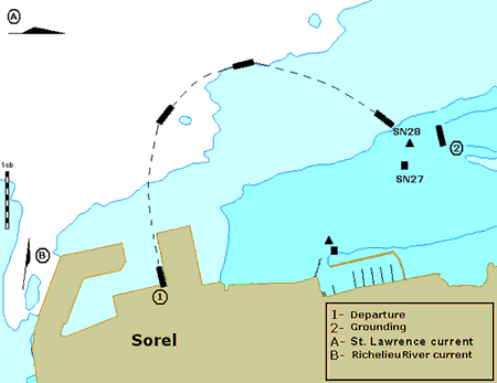 At 0530, winds were negligible, but the fog reduced visibility to less than 30 m as the vessel prepared to unberth and start its northbound crossing from Sorel. The ship's whistle was activated and lookouts were posted forward and in the wheelhouse. Both radars were turned on and set in relative motion display, unstabilized, head-up presentation.