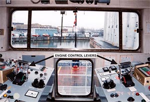 The Catherine-Legardeur is a double-ended ferry that carries passengers and vehicles across the St. Lawrence River between Sorel, Quebec, and Saint-Ignace-de-Loyola, Quebec. Both ends of the vessel are identical, each having a centreline rudder and propeller and a boarding ramp that provides vehicles with direct roll-on, roll-off convenience (see Photo 1). Dual engine and rudder controls are positioned at a central conning position in the wheelhouse, such that they can be readily activated by a single operator (see Photo 2).