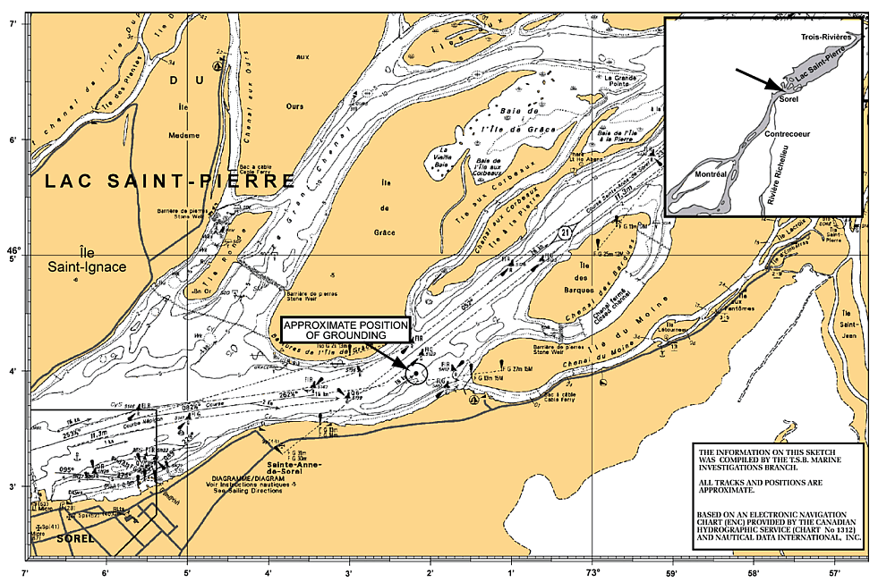 The Horizon grounded in the ecologically sensitive area of the Sorel Archipelago. Although tides are not present, water levels can vary as much as 50 cm within a few days, depending on rainfall and runoff from the Great Lakes. The channel bottom, composed primarily of sand and mud, presents no great dangers, and currents are light. Sea swell is not present, and the proximity of land in all directions means that wave action is reduced even in high winds. A salvage operation, however, can still prove challenging and time consuming, as this occurrence demonstrated.
