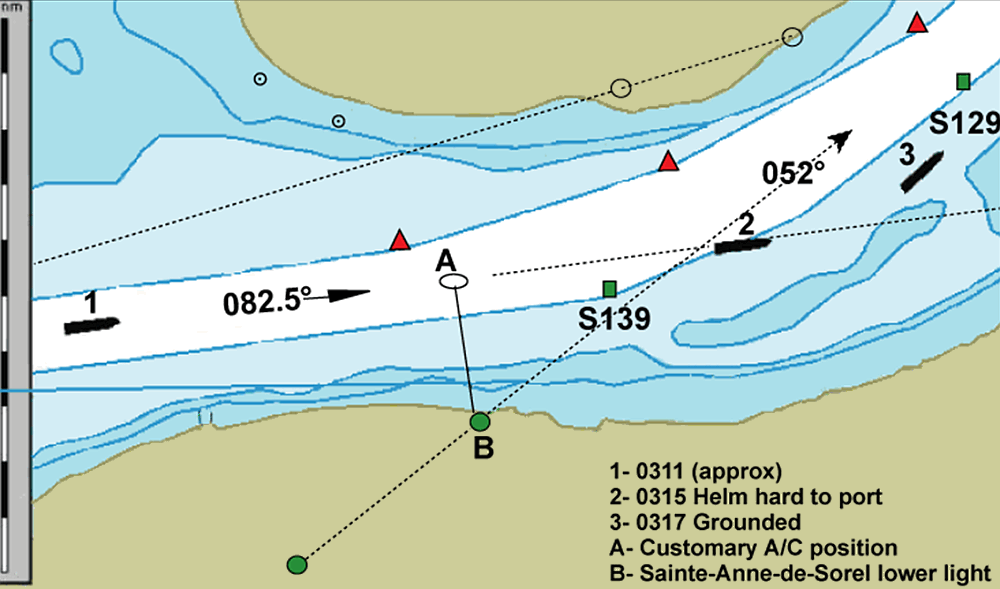 Soon after the vessel passed buoy S-139 on the starboard side, the helmsman noticed a tendency for the vessel to swing to port. He applied 5 and then 10 degrees of starboard helm to maintain the ordered course, but the vessel continued the trend to port. The helmsman read aloud the descending ship's heading, zero, eight, three - zero, eight, two - zero, eight, one. At this point, the pilot stood up and ordered hard-a-port. The helm was applied accordingly, and the vessel began to swing in that direction. As the vessel turned to port, it also slowed down and made contact with the muddy channel bottom. At 0317, the vessel grounded on the 056°G heading, in position 46°03′ 57″ N latitude, 073°02′ 13″ W longitude, approximately one cable to the southeast of the channel limit (see Figure 1). The Marine Communications and Traffic Services (MCTS) centre at Montréal was contacted and made aware of the situation. Damage to the vessel was minor.