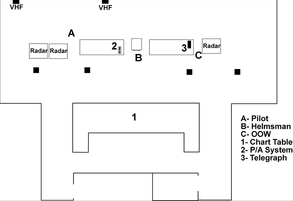 The Horizon's bridge layout is typical of the majority of ocean-going cargo vessels. The arrangement can be seen in Figure 2, which shows the position of the bridge team members just before the grounding. The four black squares just aft of the instruments and forward of the chart table are structural pillars that extend from deck to deckhead.