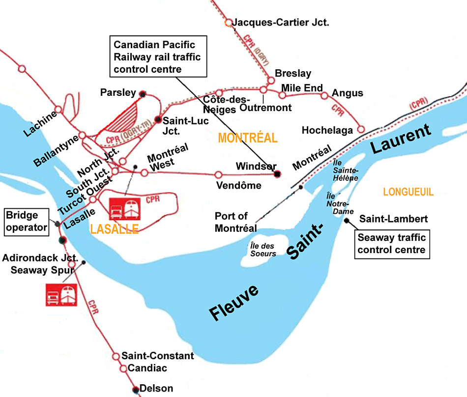 The bridge operator is employed by CPR. He works as an Interlocking RTC at Seaway Interlocking and is supervised by the RTC of the Adirondack Subdivision. He maintains contact by telephone and radiotelephone with a marine traffic controller based at the Saint-Lambert traffic station (Seaway Beauharnois). Bridge operation along with track interlocking and switching are all performed by the bridge operator; presently, these duties cannot be performed remotely. In other words, the bridge operator operates the bridges, including rail signal and interlocking on his own - a condition prone to single-point failure, as in this occurrence.