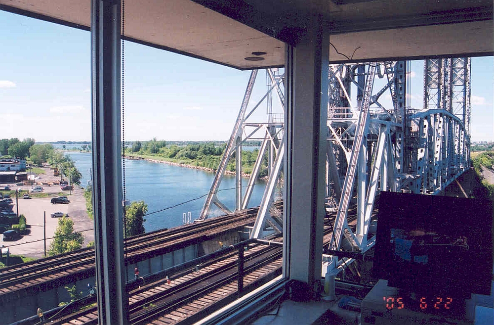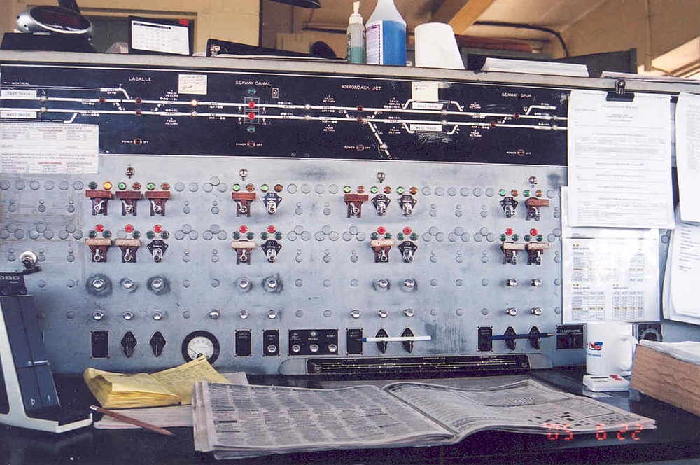 A control tower sits on the south shore next to the CPR bridges. From the control position, the field of vision is such that it allows the operator to observe as much railway traffic as marine traffic (see Photo 2). There is a control system for raising the lift spans of bridges 7A and 7B and another for interlocking and switching tracks in the Seaway Canal, Adirondack Junction,and Seaway Spur zones. Lift span operations are carried out using a computer console. System programming was developed and is maintained by the St. Lawrence Seaway Management Corporation (SLSMC) (see Photo 3). Track interlocking and switching is done using switches on a mimic panel supplied and maintained by CPR (see Photo 4). Marine and railway systems must meet specific traffic conditions to allow the passage of either a vessel or a train. These two systems are interdependent in order to limit traffic to one mode of transport at a time.