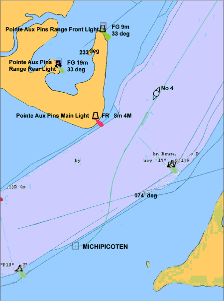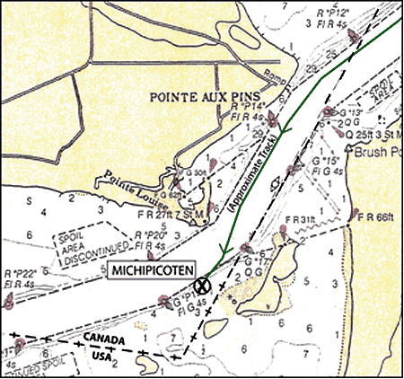 The port 3 cm radar and the starboard 10 cm radar were operating and set to range scales of 1.5 and 3 miles, respectively. River conditions were calm with increasing periods of reduced visibility in fog patches. The vessel's fog signal was not sounding nor was an additional lookout posted. None of the Michipicoten's wheelhouse windows were opened to improve the view ahead and increase the chance of hearing any signals from other vessels. At 0701, the Michipicoten increased speed to approximately 8.5 knots and left the Canadian channel. While communicating with Soo Traffic Control, upon entering the upper St. Mary's River, the master again misidentified his vessel as the Saginaw. At this time, the Michipicoten was approximately one-half to three-quarters of a mile ahead of the tug Dorothy Ann and barge Pathfinder. Both vessels were upbound and had just departed McArthur Lock. There was VHF communication between the vessels regarding the possibility of the tug and barge overtaking the Michipicoten. Near the line between Brush Point Buoy G13 and Pointe aux Pins, the Michipicoten altered course to port to follow the recommended main channel course of 210° true (T) in the direction of Pointe Louise. The next course alteration to 238° T (starboard course alteration) would take place at the line between Brush Point Buoy G17 and Pointe Louise. At approximately 0723, while approaching the next course alteration, fog had obscured the channel's easterly limit on the vessel's port side, and the master could not see the next forward set of ranges. While attempting to see buoys on the channel's easterly limit, he was in communication with Soo Traffic Control.